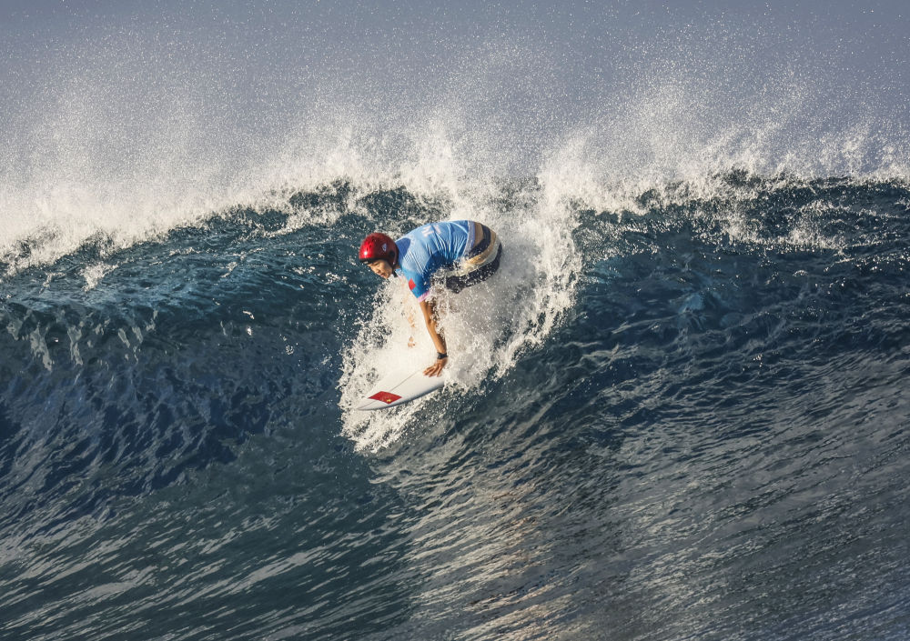 ↑8月1日,杨思琪在塔希提进行的女子冲浪项目第三轮比赛中。