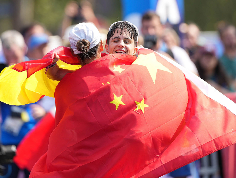 ↑8月1日,女子20公里竞走冠军杨家玉(左)赛后与西班牙选手佩雷斯拥抱庆祝。