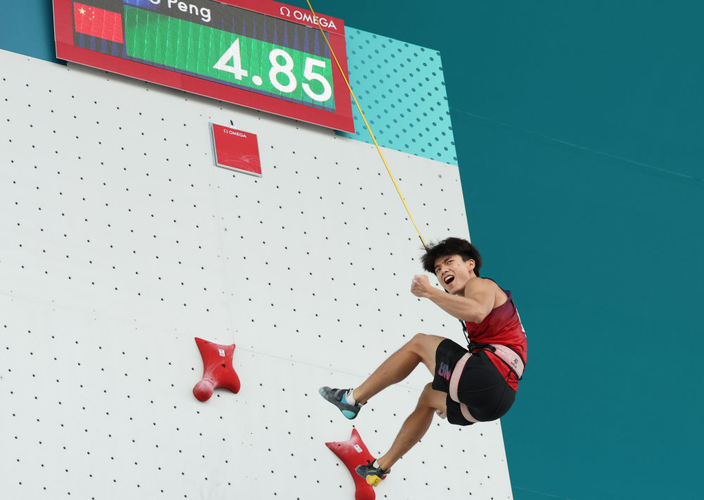 ↑8月8日,伍鹏夺得攀岩男子速度赛银牌。这是中国攀岩队首次夺得男子项目的奥运奖牌。