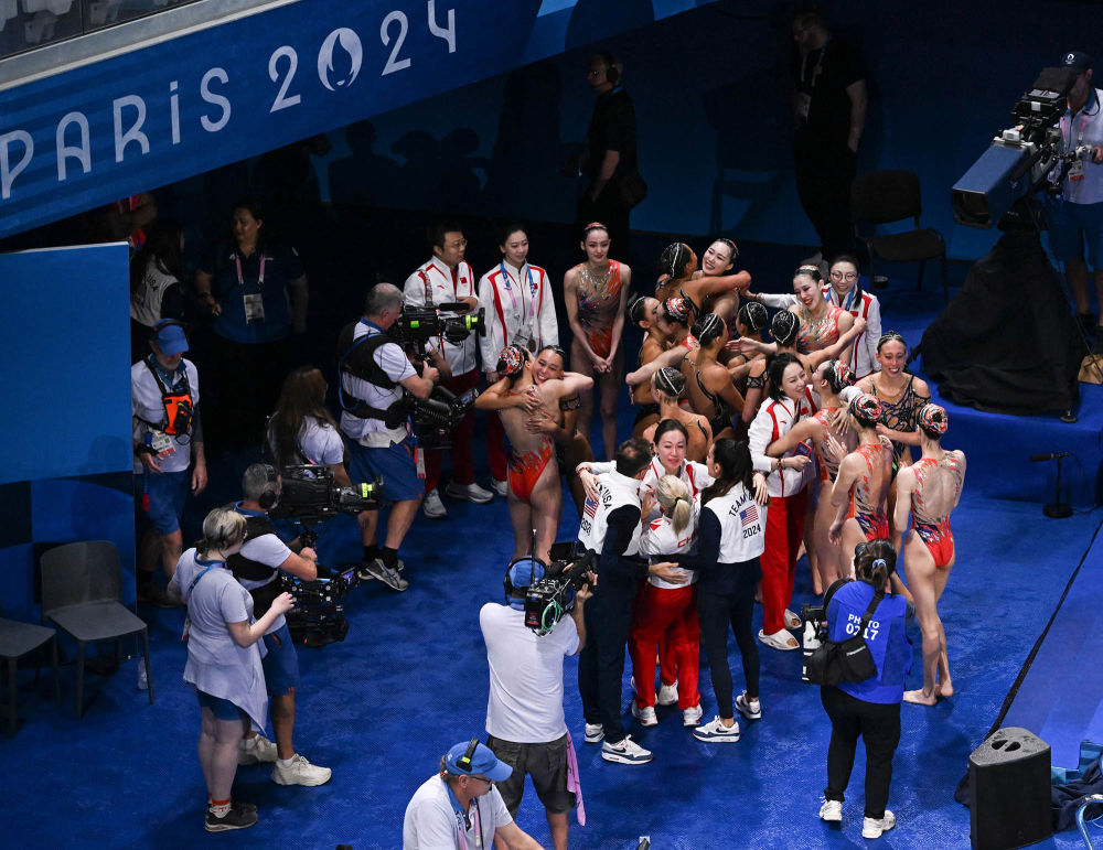 ↑8月7日,中国队夺得花样游泳集体项目冠军后与亚军美国队拥抱致意。