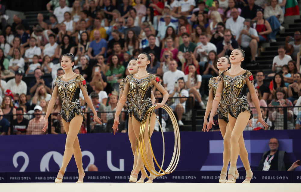↑8月10日,中国队夺得艺术体操项目集体全能冠军。这是中国艺术体操队首次获得奥运金牌。