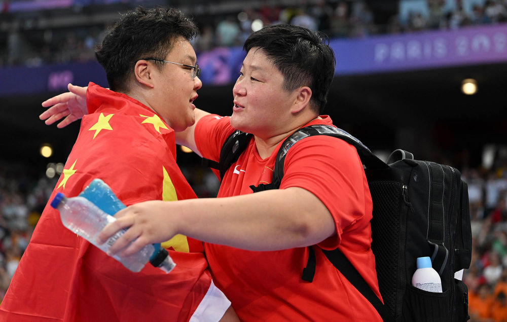 ↑8月9日,女子铅球运动员巩立姣(右)与队友宋佳媛在比赛后拥抱。
