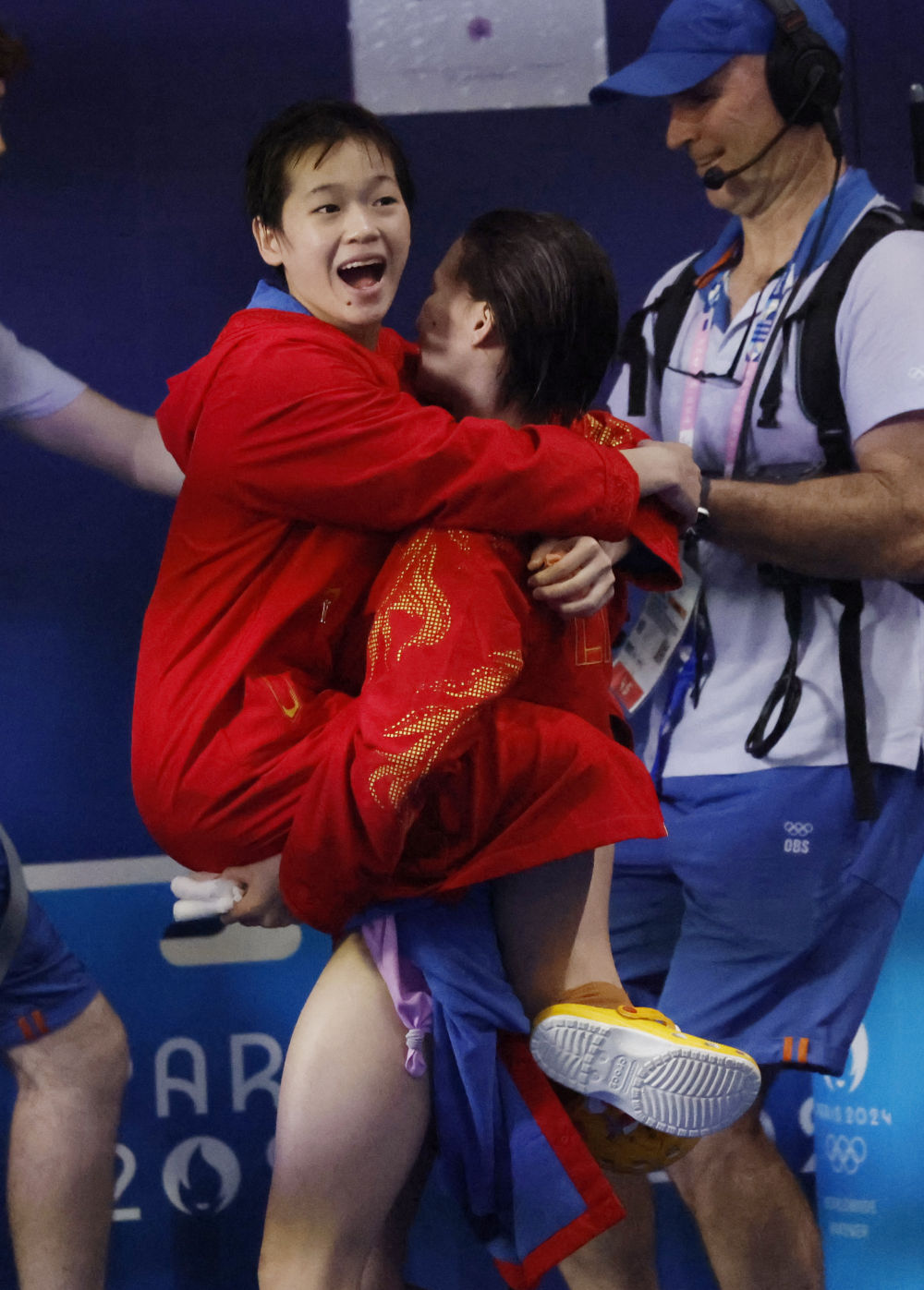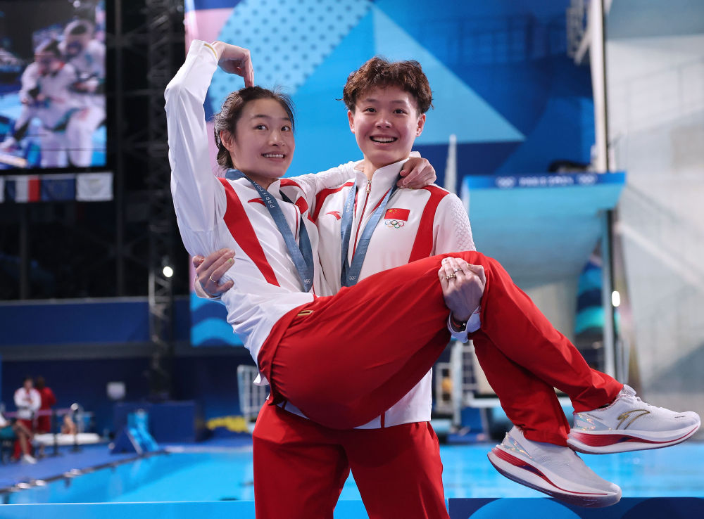 ↑7月27日,夺得跳水女子双人3米板冠军后,陈艺文(右)将昌雅妮抱起。