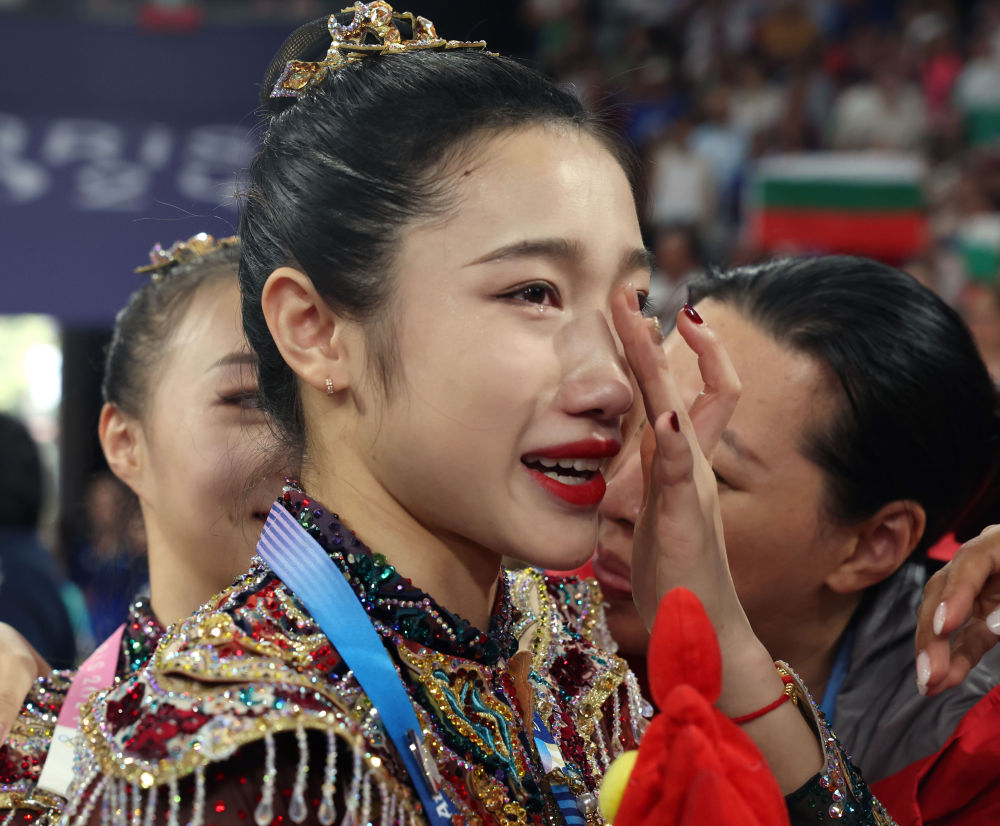 ↑8月10日,中国队夺得艺术体操项目集体全能金牌。赛后,队员们激动落泪。
