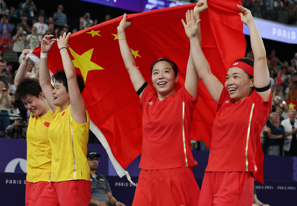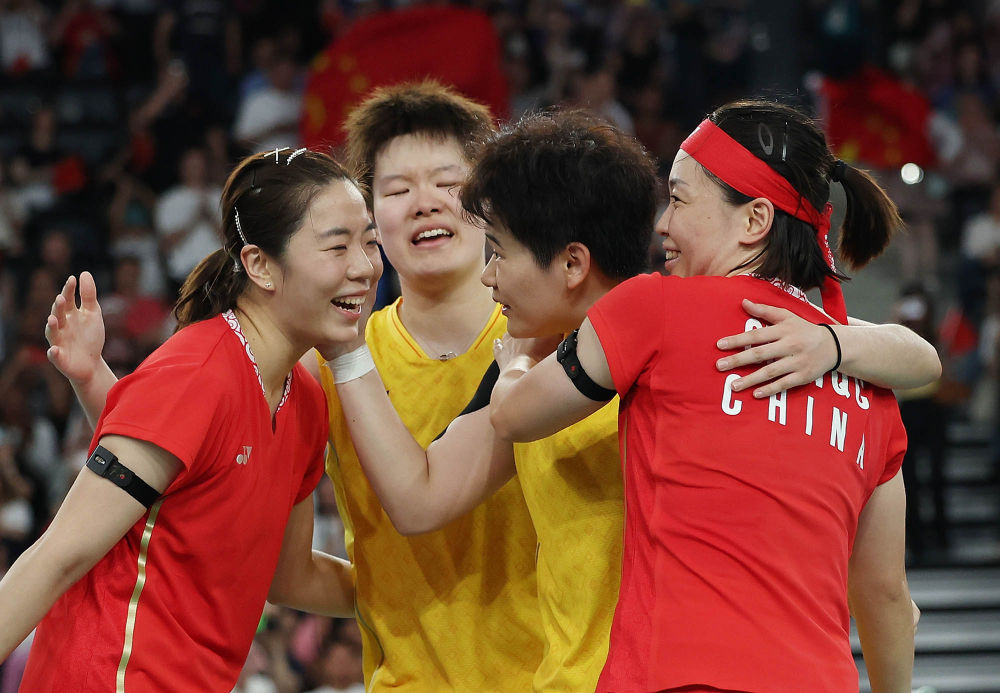 ↑8月3日,陈清晨(右一)/贾一凡(右二)组合和刘圣书(左一)/谭宁组合包揽羽毛球女双冠亚军后庆祝。