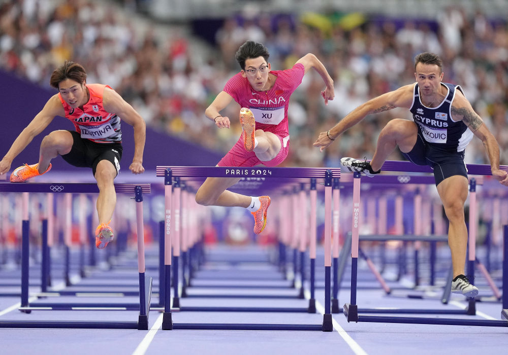 ↑徐卓一(中)在田径男子110米栏半决赛中。