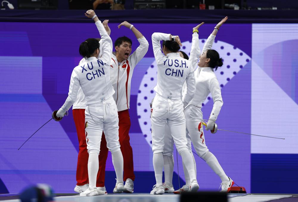 ↑7月30日,在女子击剑团体重剑半决赛前,中国队队员相互鼓劲。
