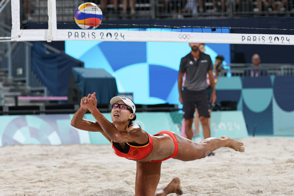 ↑8月1日,薛晨在女子沙滩排球小组赛中救球。35岁的薛晨第四次参加奥运会。