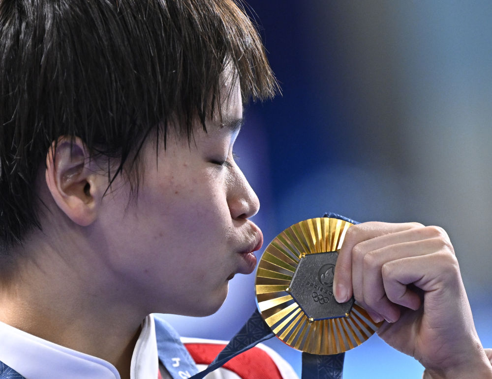 ↑8月6日,全红婵夺得跳水女子10米台冠军后亲吻金牌。