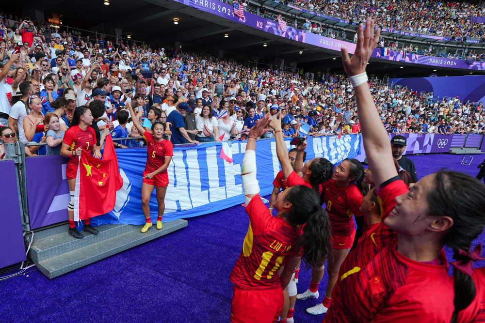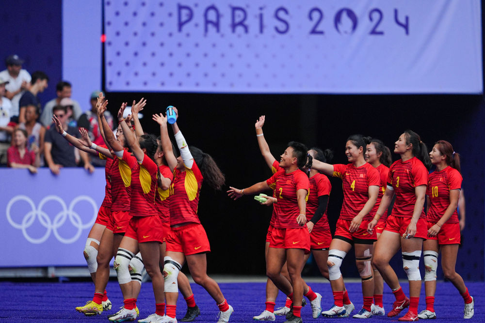 ↑7月30日,在七人制橄榄球女子五、六名排位赛后,中国队球员向观众致意。