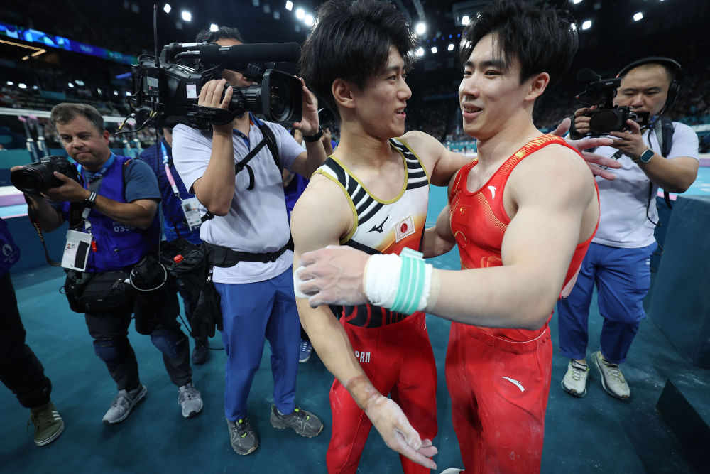 ↑7月29日,在体操男子团体决赛中,中国队选手张博恒(右二)在单杠比赛后与日本队选手桥本大辉(右三)相互致意。