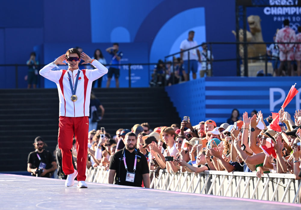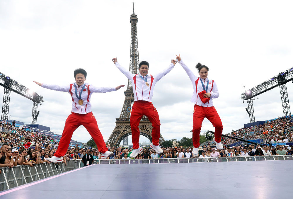 ↑8月9日,巴黎奥运会举重冠军侯志慧(左)、李发彬(中)和罗诗芳在巴黎特罗卡德罗广场的冠军公园庆祝,与观众分享荣耀。