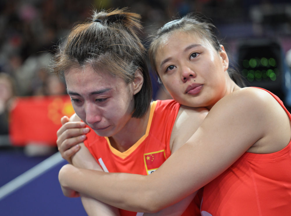 ↑女子排球四分之一决赛中,中国队2比3不敌土耳其队。赛后龚翔宇(右)安慰落泪的王媛媛。
