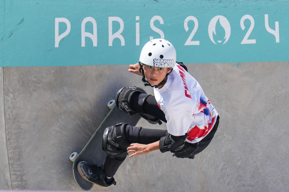 ↑8月6日,郑好好在滑板女子碗池预赛中。