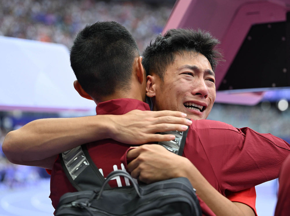 ↑8月4日,在田径男子跳远资格赛后,王嘉男(前)拥抱未能晋级的队友石雨豪。