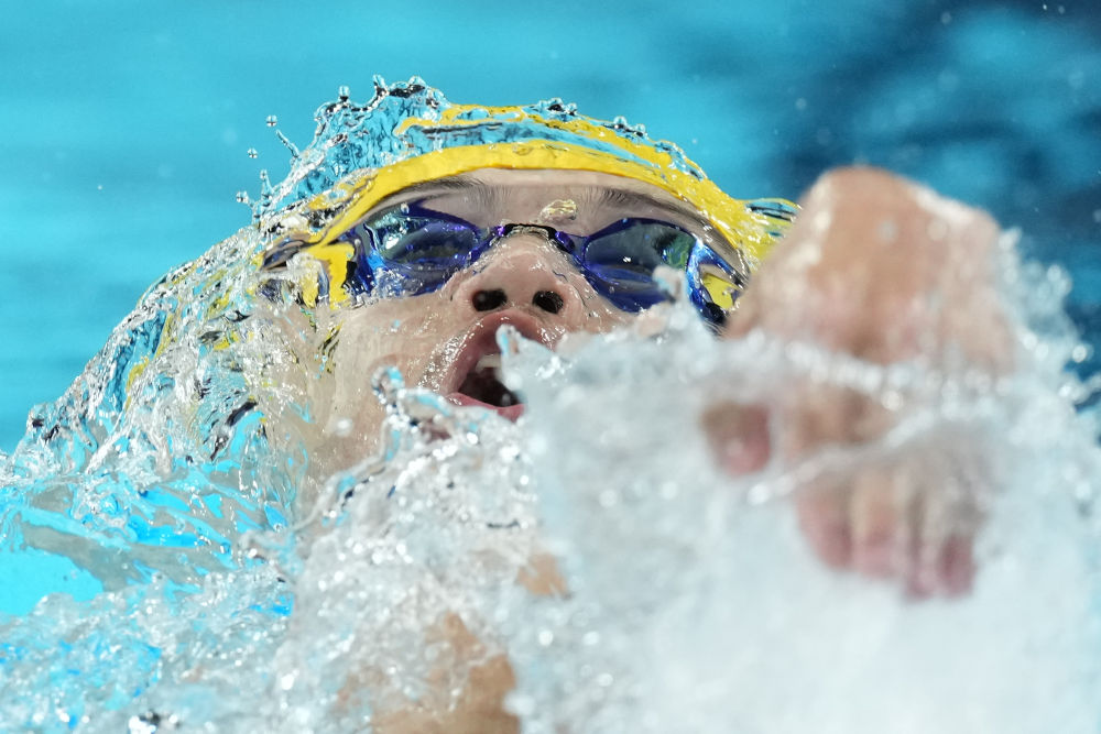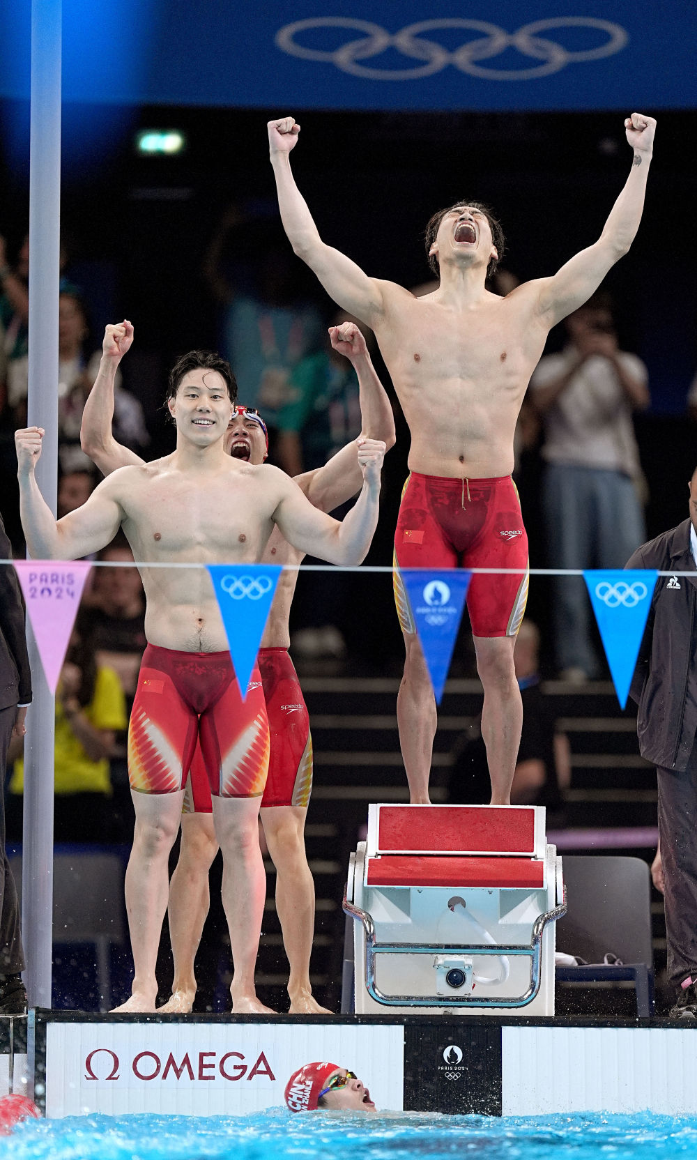 ↑7月31日,潘展乐(右二)在男子100米自由泳决赛中率先触线,以46秒40的成绩夺冠,并打破世界纪录。
