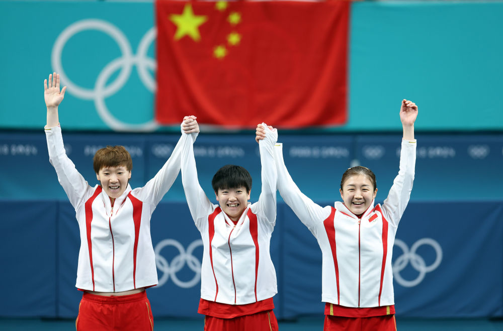 ↑8月10日,由王曼昱、孙颖莎、陈梦(从左至右)组成的中国队在乒乓球女团金牌赛中3比0战胜日本队,实现五连冠。这枚金牌也是中国体育代表团在夏季奥运会上的第300金。
