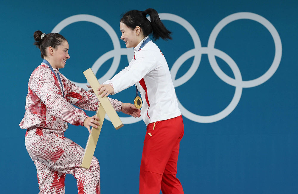 ↑8月8日,在女子举重59公斤级颁奖仪式上,冠军中国选手罗诗芳(右)与亚军加拿大选手沙朗拥抱。