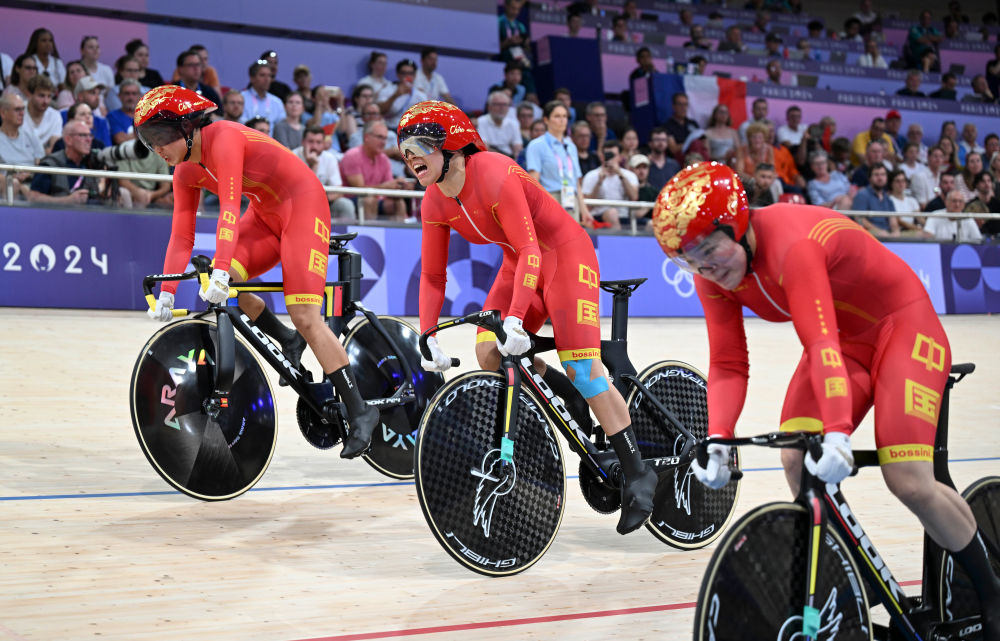↑8月5日,在场地自行车女子团体竞速资格赛中,由鲍珊菊、郭裕芳和苑丽颖组成的中国队排名第五,顺利晋级。