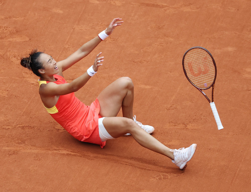 ↑8月3日,郑钦文夺得女子网球单打冠军后庆祝。