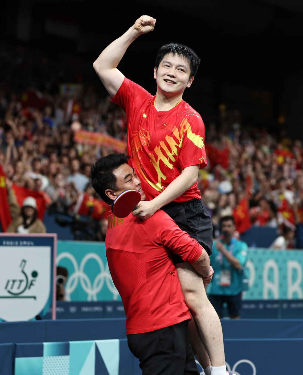 ↑8月4日,樊振东获得乒乓球男子单打冠军后被教练王皓抱起庆祝。