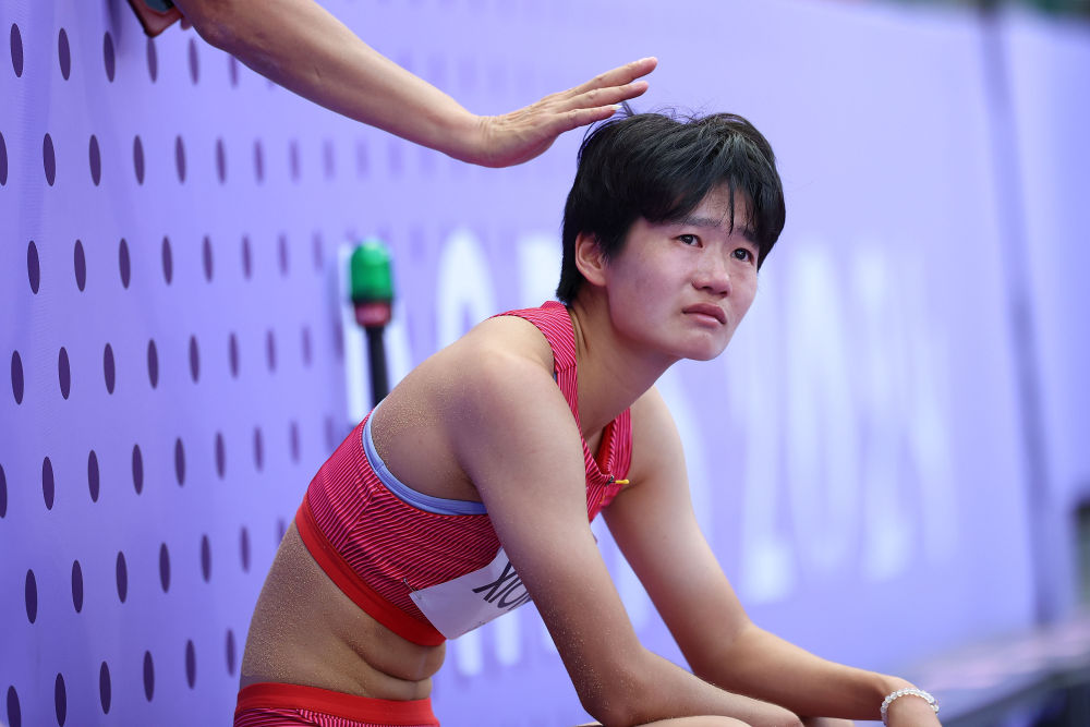 ↑8月6日,中国选手熊诗麒无缘田径女子跳远决赛后落泪。
