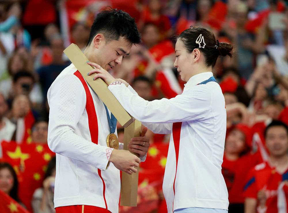 ↑在羽毛球混合双打颁奖仪式上,黄雅琼(右)为搭档郑思维戴上金牌。
