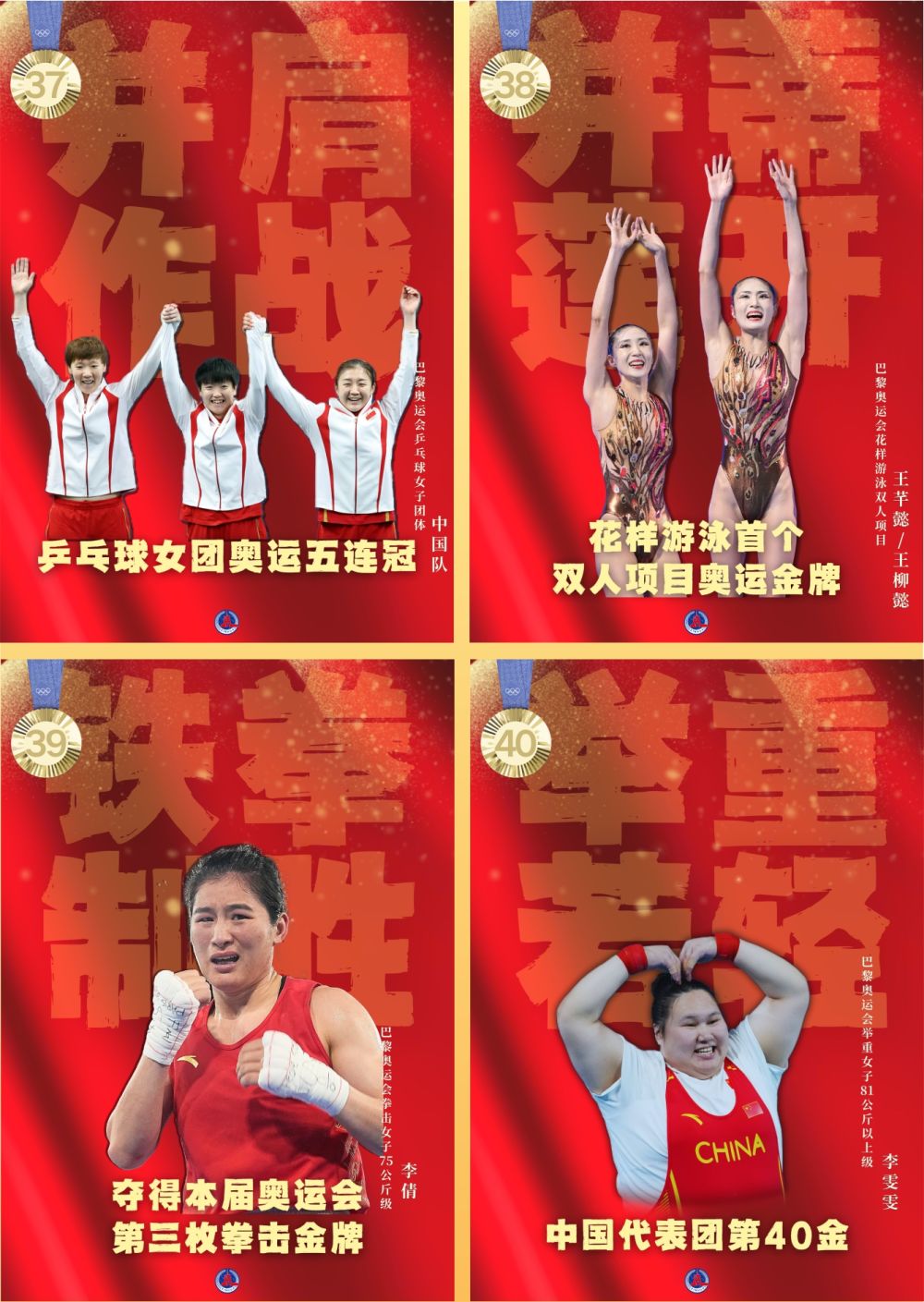 ↑8月4日,由徐嘉余(上右)、覃海洋(上左)、孙佳俊(上中)、潘展乐组成的中国队夺得游泳男子4x100米混合泳接力冠军。这枚金牌打破了美国队在这个项目上长达40年的垄断。