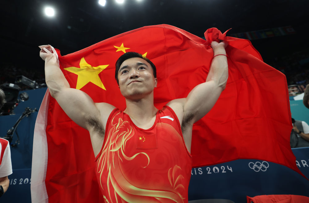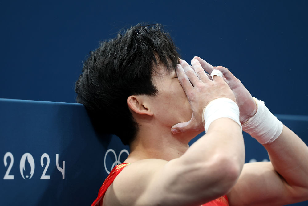 ↑8月5日,张博恒获得体操项目男子单杠铜牌后。