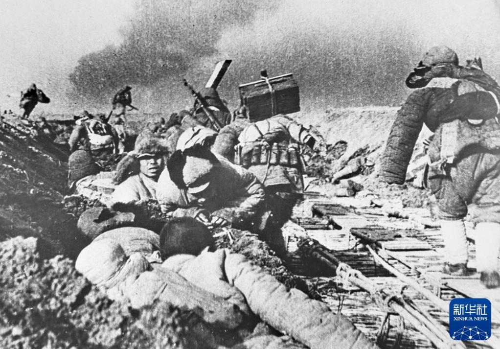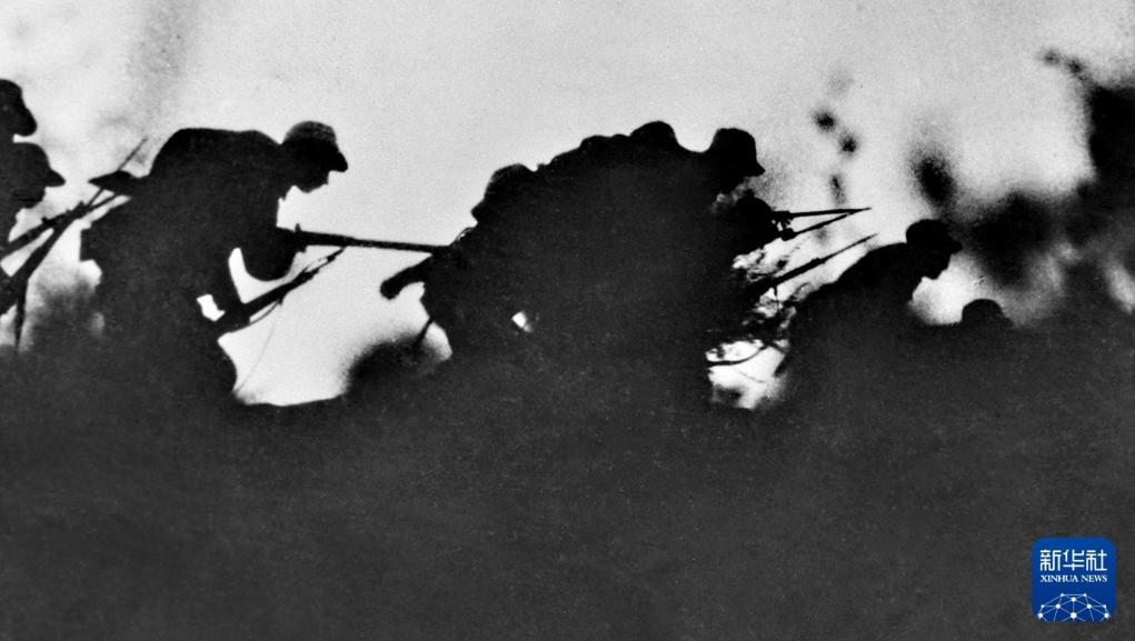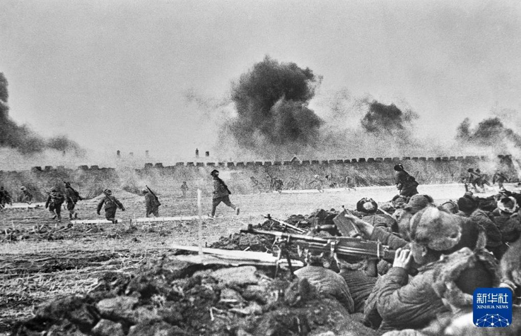 1948年10月,在辽沈战役中,东北野战军战士们在炮火掩护下对锦州守敌展开猛攻。新华社发(张祖道 摄) 中国照片档案馆馆藏