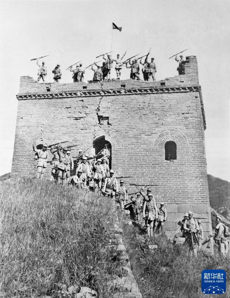 1940年8月,八路军攻克河北涞源县日军据点东团堡,战士们在长城烽火台上欢呼胜利。新华社发(沙飞 摄) 中国照片档案馆馆藏