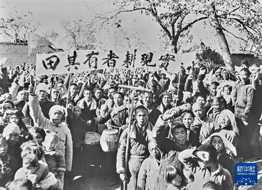 1947年10月10日,中共中央公布《中国土地法大纲》,冀中农民集会庆祝。新华社发(林杨 摄) 中国照片档案馆馆藏
