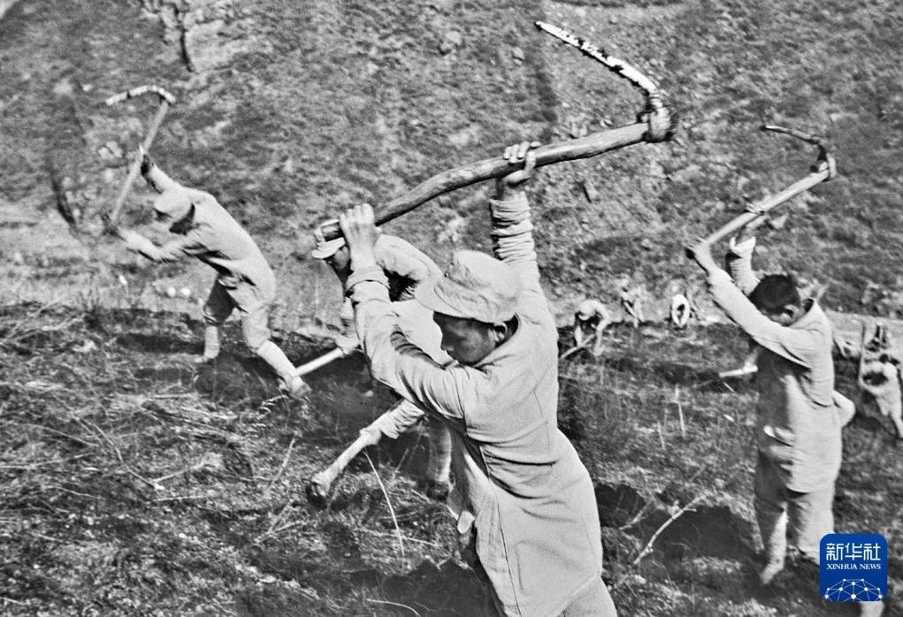 1942年,在大生产运动中,晋察冀边区八路军指战员开垦荒地。新华社记者 石少华 摄