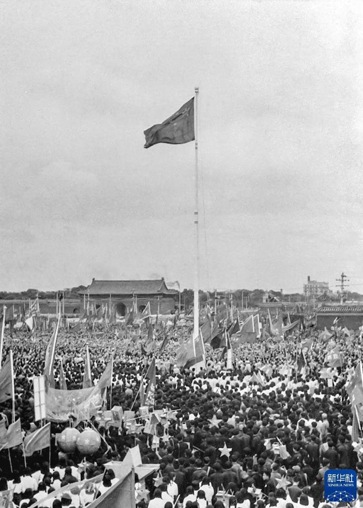 1949年10月1日,中华人民共和国成立。在开国大典会场上,第一面五星红旗冉冉升起,迎风飘扬。新华社发 中国照片档案馆馆藏