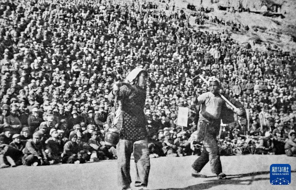 1943年2月,陕西延安鲁迅艺术学院学生王大化、李波(前左)为军民演出秧歌剧《兄妹开荒》。新华社发(吴印咸 摄) 中国照片档案馆馆藏