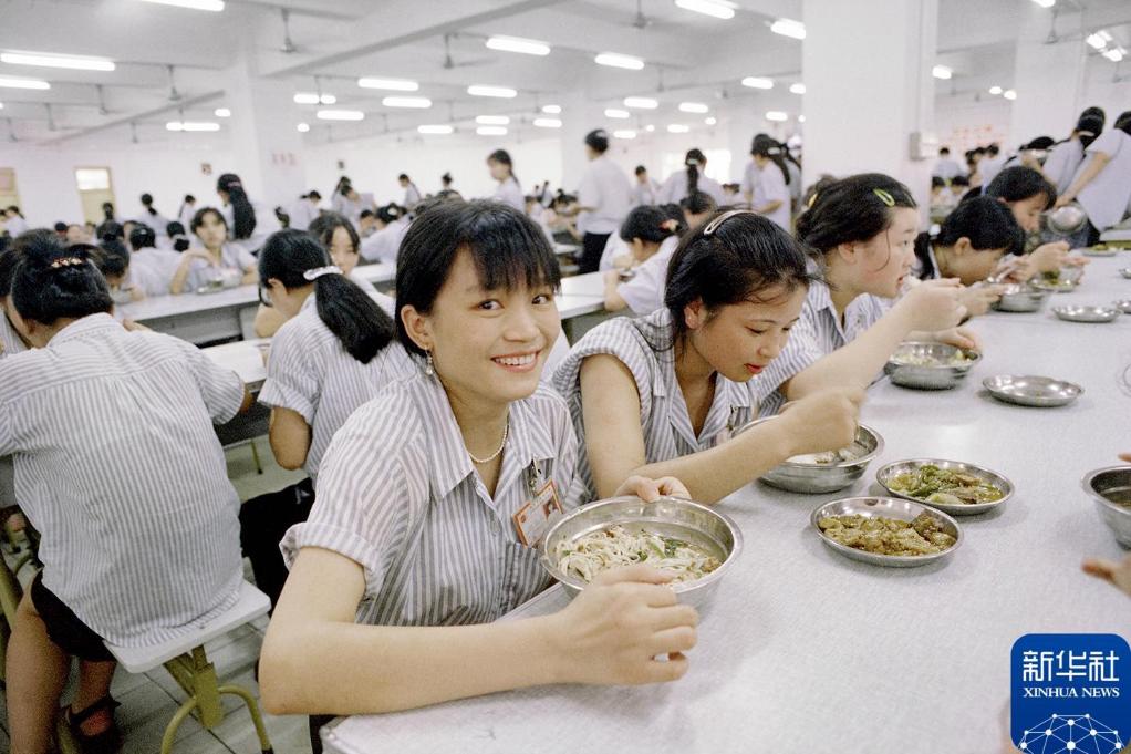 1998年10月,在广东东莞长安镇,来自四川的女工钟琼英(前左一)和伙伴们一起吃午饭。 新华社记者 周家国 摄