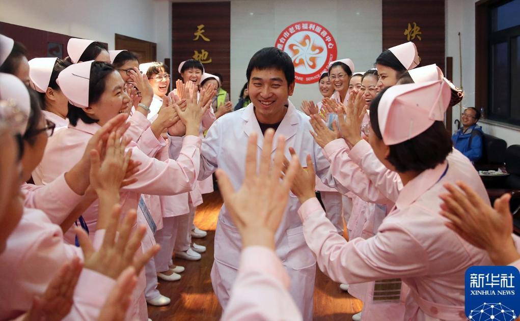2015年10月20日,在山东烟台举行的第五届全国民政行业职业技能竞赛暨全国第三届养老护理员职业技能竞赛中,唯一进入决赛的男护理员王壮在赛后得到女护理员们的鼓励。 新华社记者 殷刚 摄
