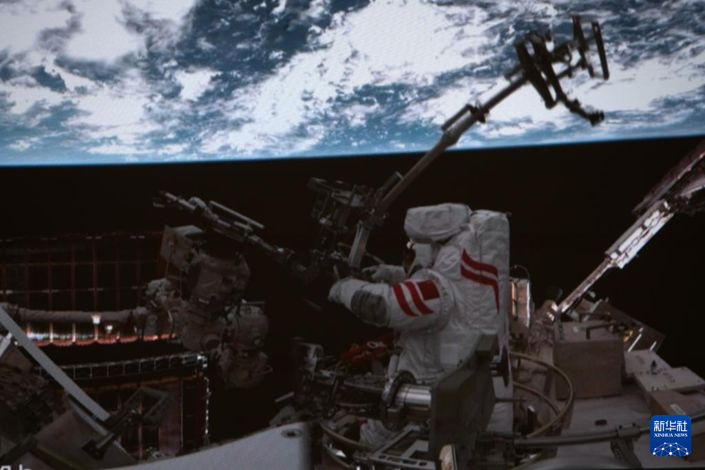 这是12月9日在北京航天飞行控制中心屏幕上拍摄的神舟二十一号乘组航天员武飞在舱外工作的画面。