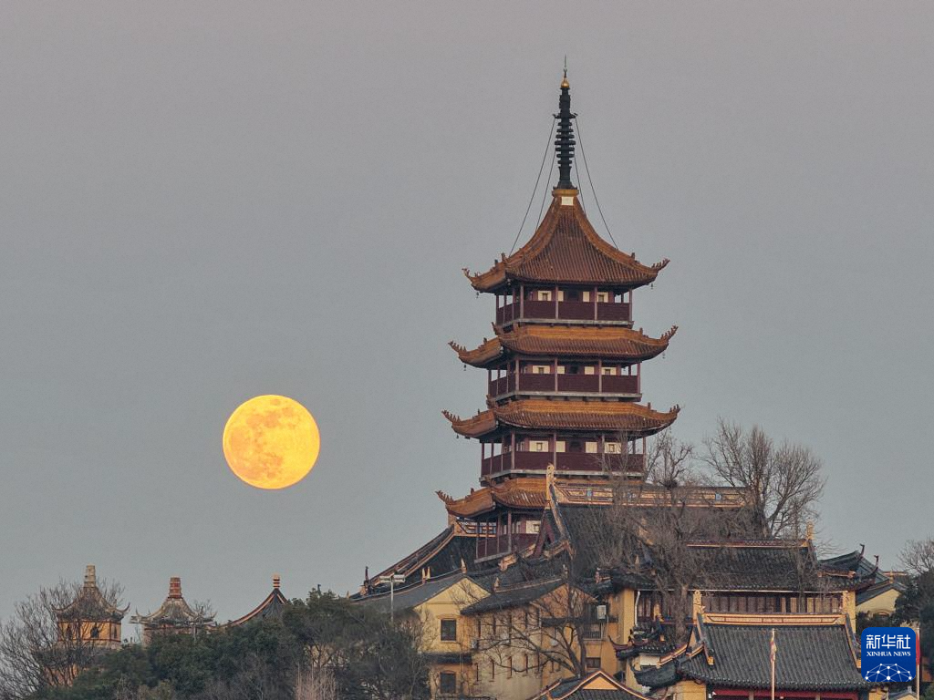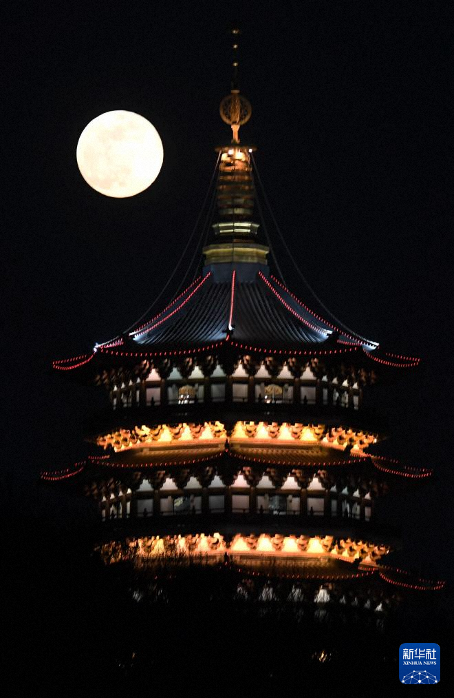 1月3日在浙江省杭州市拍摄的月亮和雷峰塔。