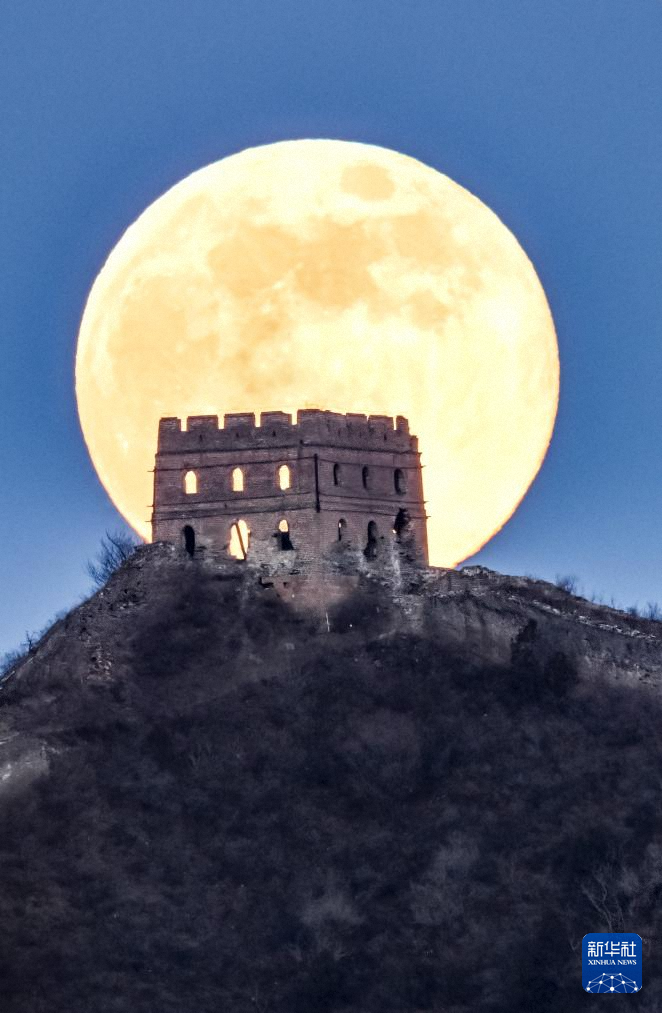 1月3日在北京市密云区古北口镇拍摄的蟠龙山长城二十四眼楼与月亮。