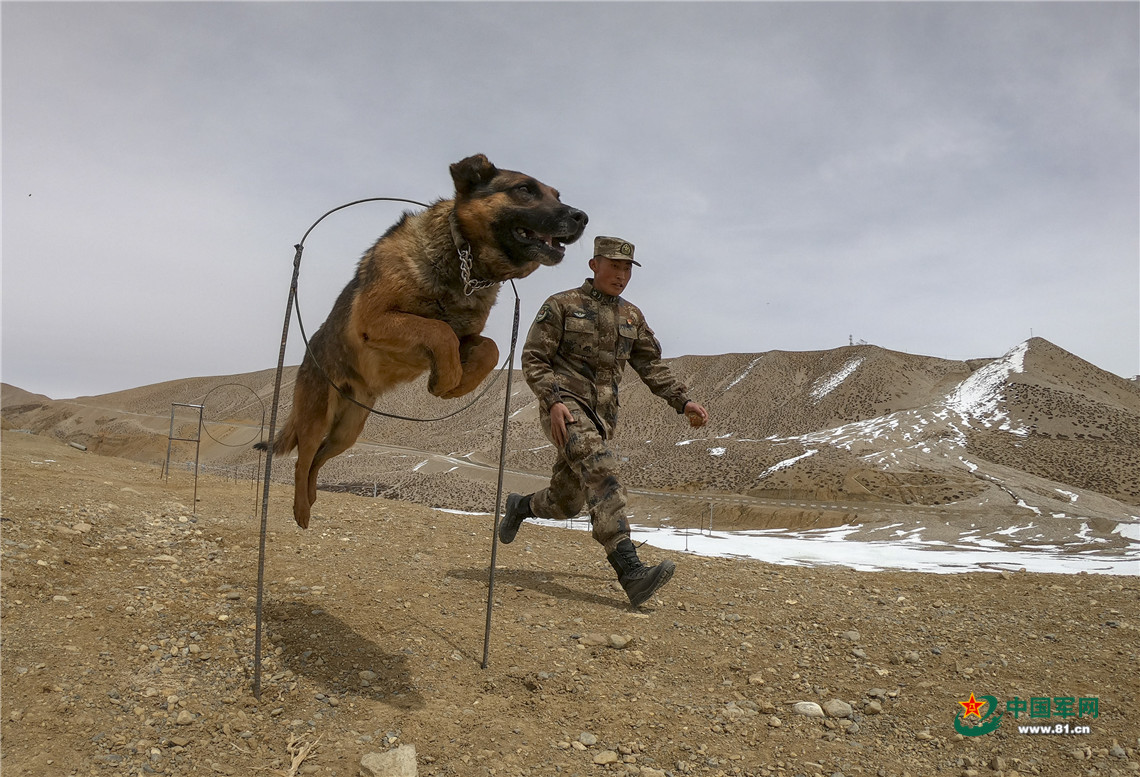4月14日,驻守在海拔4600多米的西藏阿里军分区某边防团波林边防连,组织官兵对军犬进行服从性、通过障碍等训练,进一步强化军犬在边境管控和日常巡逻中发挥的重要作用。