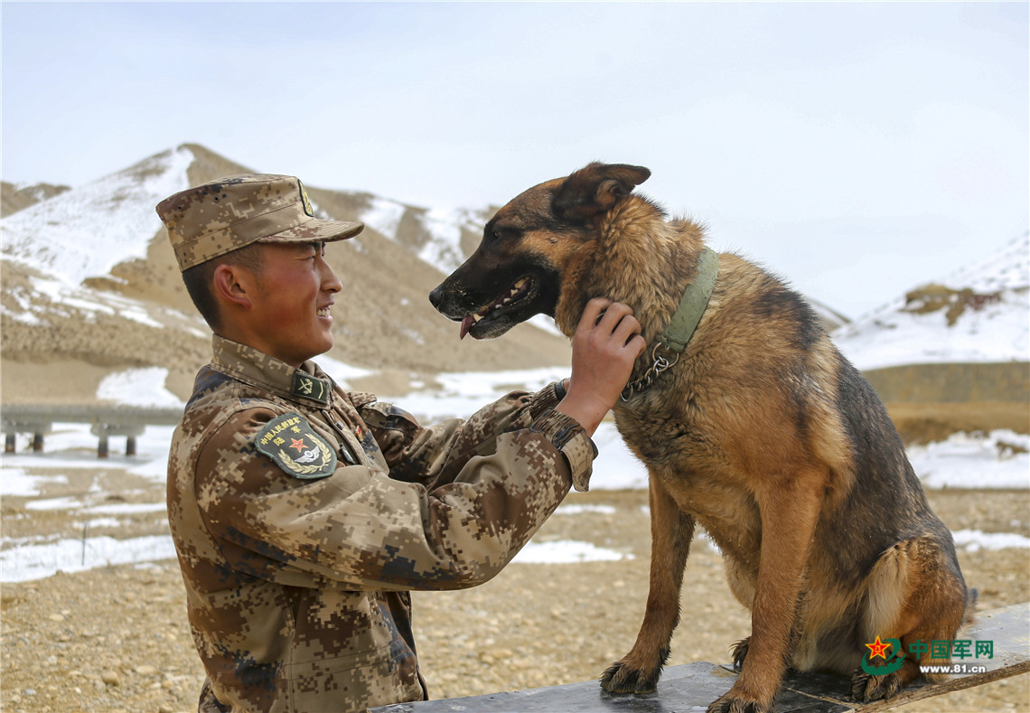 训导员正在为训练结束的军犬放松按摩。