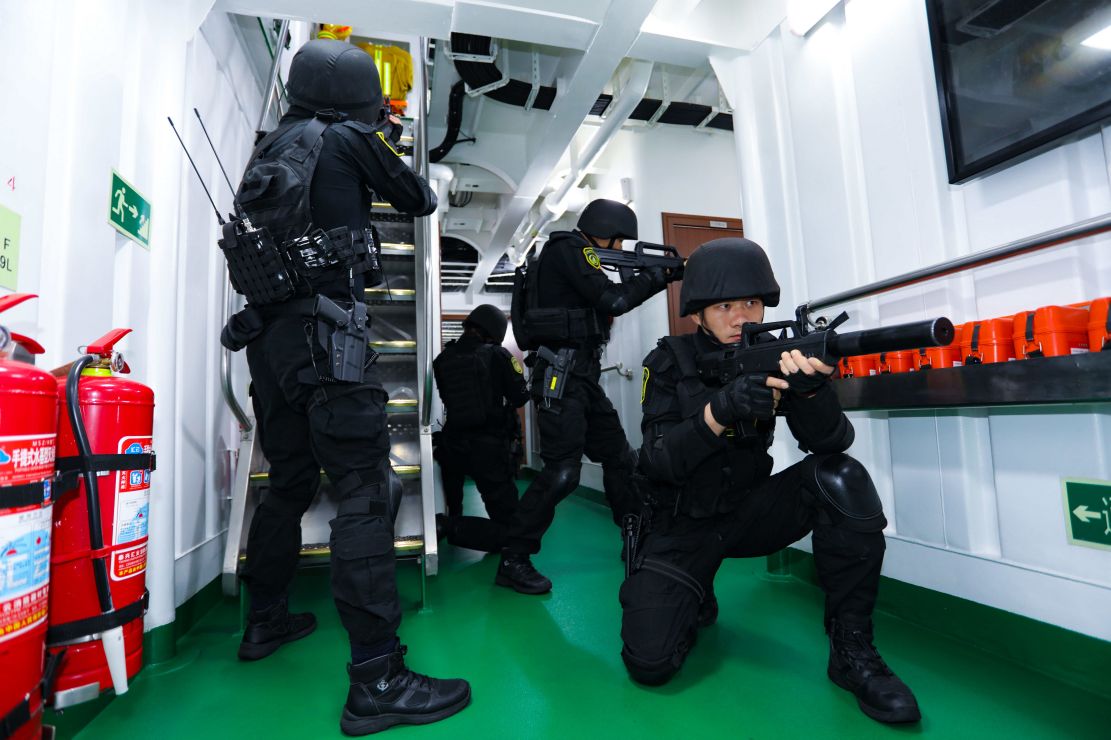 挂梯、攀爬、翻越栏杆,特战队员登船动作干净利落,上船后随即展开舱室搜索、解救人质等课目演练。现场氛围紧张、惊心动魄,特战队员以迅雷之势果断突击,将全部“海盗”控制,成功解救“被劫持商船”。