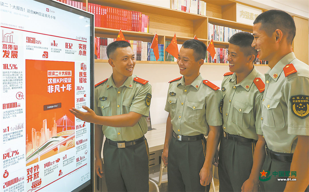 10月17日,驻守三沙永兴岛的武警海南总队海口支队机动四中队官兵,利用电子读报器学习党的二十大报告。雷 辙摄
