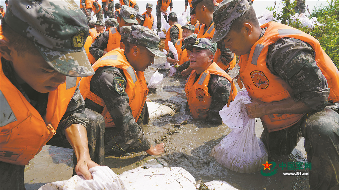 7月17日,第71集团军某旅官兵在九江市彭泽县芙蓉圩堤抢运沙袋,封堵管涌。王冠军摄