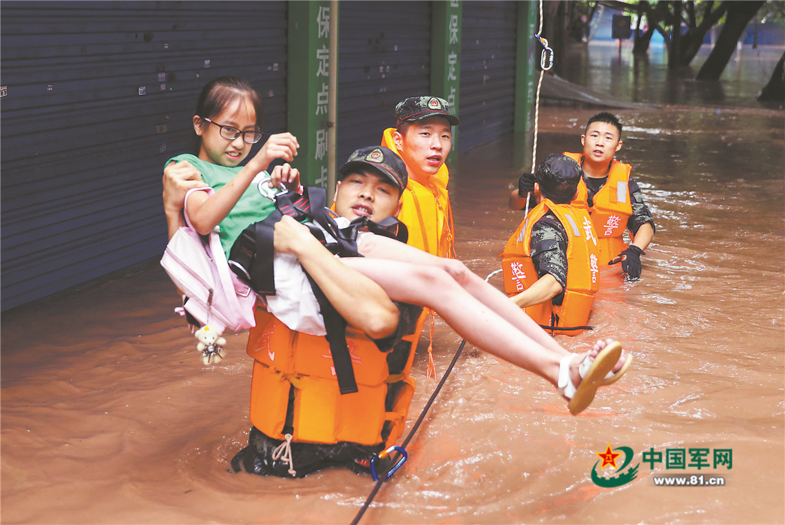 7月16日,重庆市万州区五桥镇老街积水,30余栋居民楼被淹,1000余住户被困。武警重庆总队接到命令后,立即派出140余名官兵赶赴现场救援。图为武警官兵正在转移一名被困的小女孩。邹 毅摄