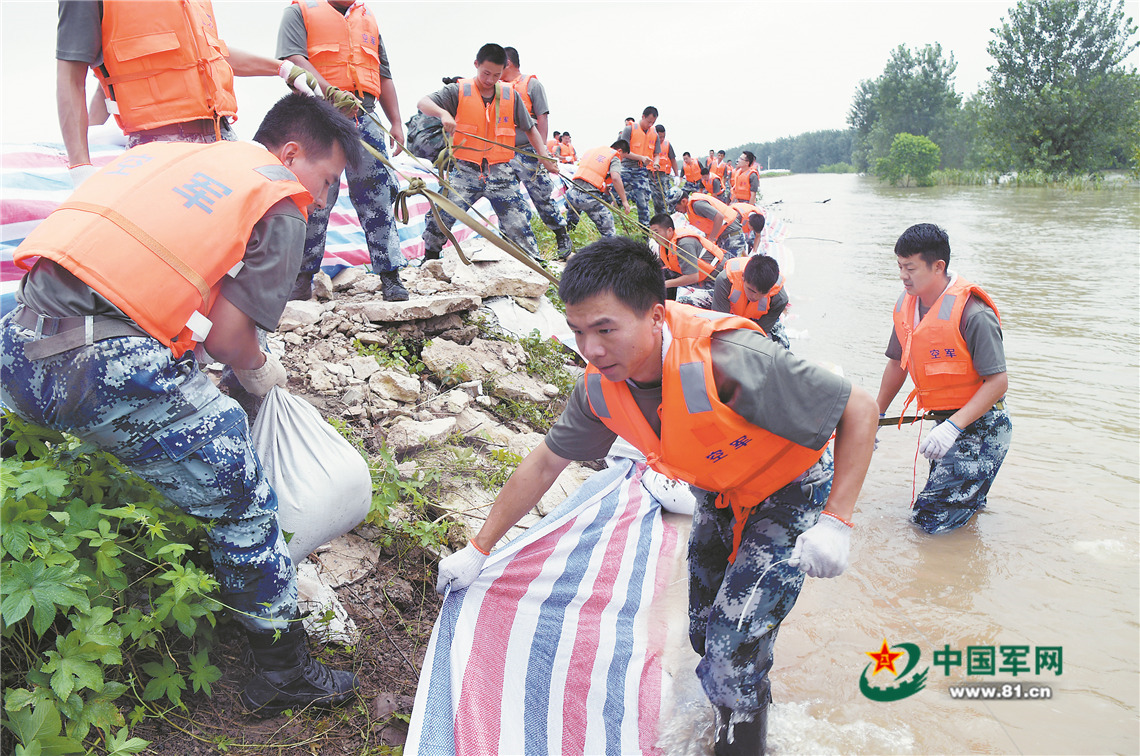 7月19日,空军航空兵某师官兵在对九江江洲镇堤坝进行防浪处理,确保大堤安全。余红春摄