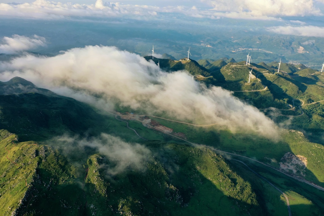 韭菜坪上风力发电设备被云雾环绕(8月19日摄,无人机照片)。