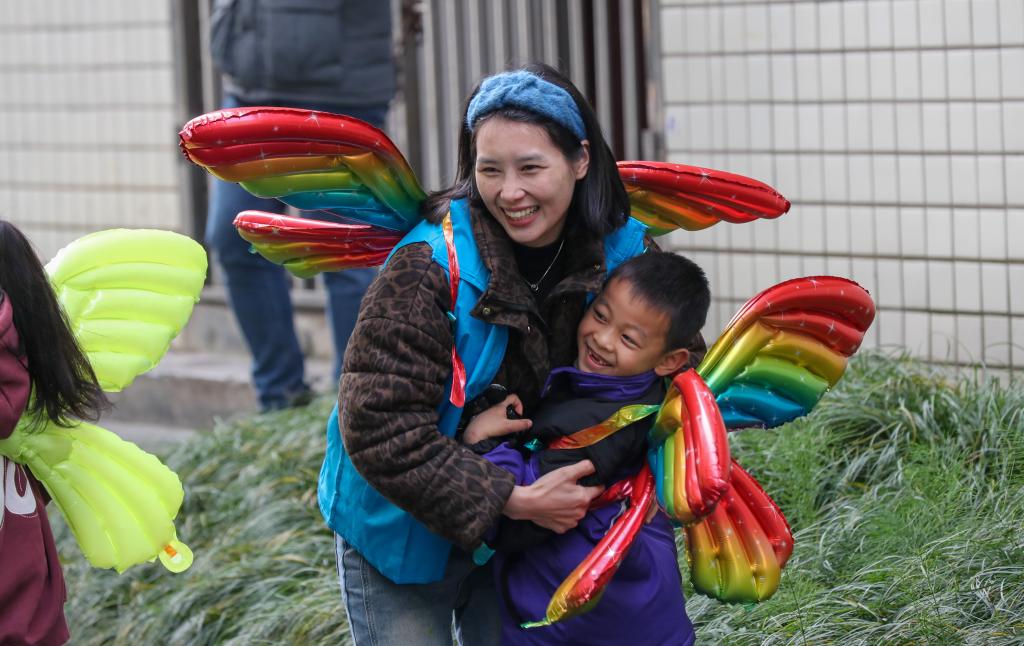 志愿者和小朋友一起做游戏(2025年2月10日摄)。2025年2月8日11时50分许,四川省筠连县沐爱镇金坪村2组突发山体滑坡,造成人员伤亡。受山体滑坡影响的群众被转移集中安置至位于沐爱镇筠连县第二中学校的临时安置点。安置点内,共青团筠连县委紧急组建返乡大学生志愿者服务队,搭建起“青青儿童乐园”。新华社发(庄歌尔摄)