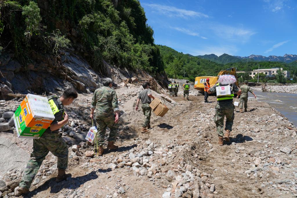 在北京市密云区冯家峪镇,救援人员为道路被阻断的村庄运送生活物资(2025年7月30日摄)。2025年7月,北京密云等区遭遇特大暴雨,多个乡镇受灾。新华社记者 鞠焕宗 摄